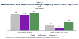 En 2024, en México había 32 millones de personas de 50 años y más: 52.8 % correspondió a mujeres y 47.2 %, a hombres. Del total de esta población, 8.8 % hablaba alguna lengua indígena y 2.8 % hablaba inglés u otro idioma. De esta última característica, 1.3 % correspondió a mujeres y 4.5 %, a hombres (ver gráfica 1).