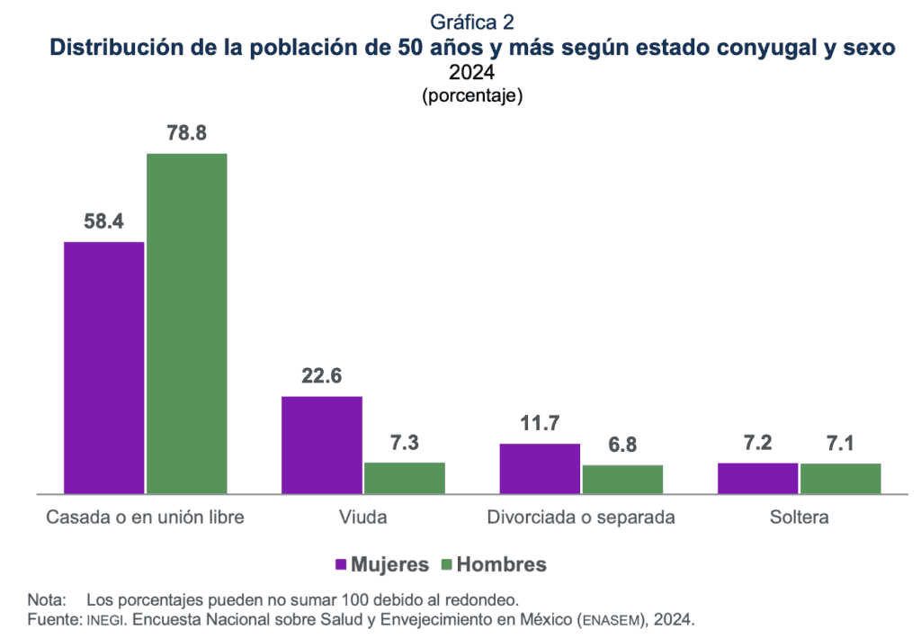 Del total de personas de 50 años y más, 68.0 % era casada o estaba en unión libre y 15.4 % era viuda. Según sexo, la proporción de hombres casados o en unión libre fue 20.4 puntos porcentuales mayor que la de mujeres. En las mujeres, la condición de viudez fue 15.3 puntos porcentuales más alta que en los hombres (ver gráfica 2).