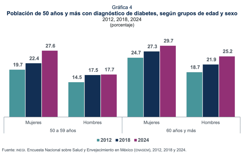 En 2024, el porcentaje de personas de 50 años y más con diabetes alcanzó 25.5. Entre 2012 y 2024, en ambos sexos se observó un incremento sostenido conforme aumentó la edad. La mayor prevalencia se presentó en las mujeres. En el periodo de 2012 a 2024, en el grupo de 50 a 59 años, el porcentaje pasó de 19.7 a 27.6 en mujeres y de 14.5 a 17.7 en hombres. Para las mujeres de 60 años y más, los porcentajes pasaron de 24.7 en 2012 a 29.7 en 2024. Para los hombres con diabetes, los porcentajes aumentaron de 18.7 a 25.2 en el mismo periodo (ver gráfica 4).