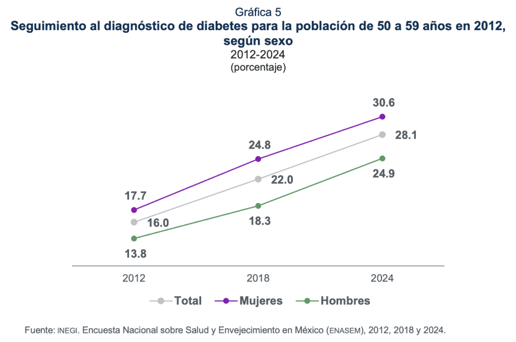 El seguimiento a lo largo del tiempo (llamado longitudinal) al diagnóstico de diabetes en una misma población muestra que, en 2012, cuando esta tenía entre 50 y 59 años, presentó niveles de 16.0 por ciento. La cifra aumentó a 28.1 % para 2024, cuando las edades eran de 62 a 71 años (ver gráfica 5).