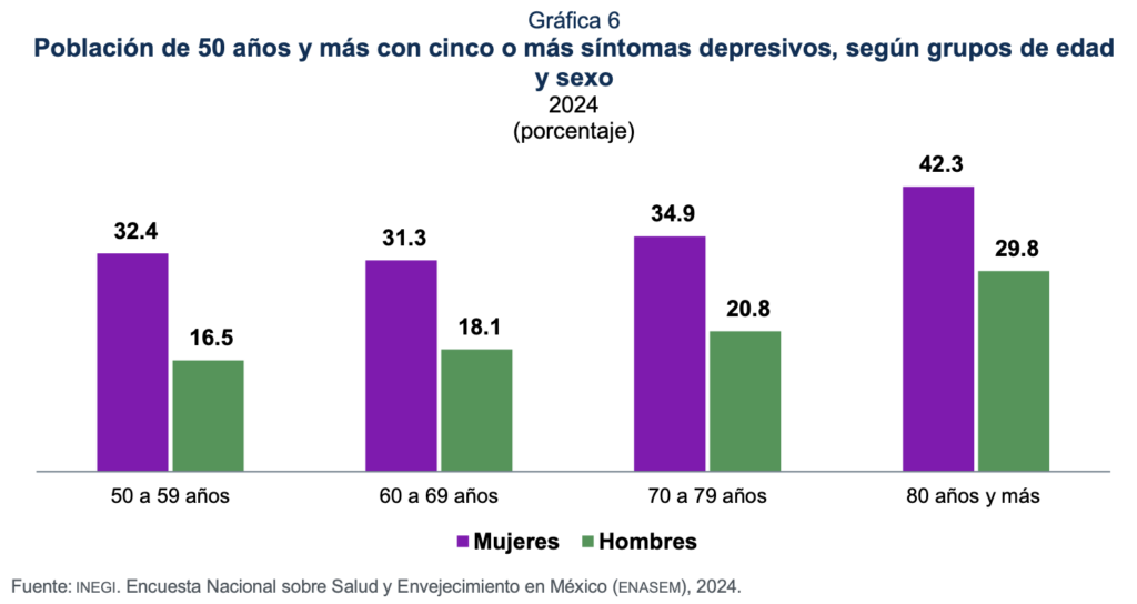 En 2024, se registró una disminución en los síntomas depresivos entre la población de 50 años y más. En las mujeres, cuya prevalencia ha sido históricamente mayor que entre los hombres, el porcentaje con cinco o más síntomas descendió de 41.2 en 2012 a 33.1 en 2024. En los hombres, estos valores se situaron en 17.1 % para 2024, tras haberse mantenido en 21.5 % para 2012 y en 21.9 % para 2018.