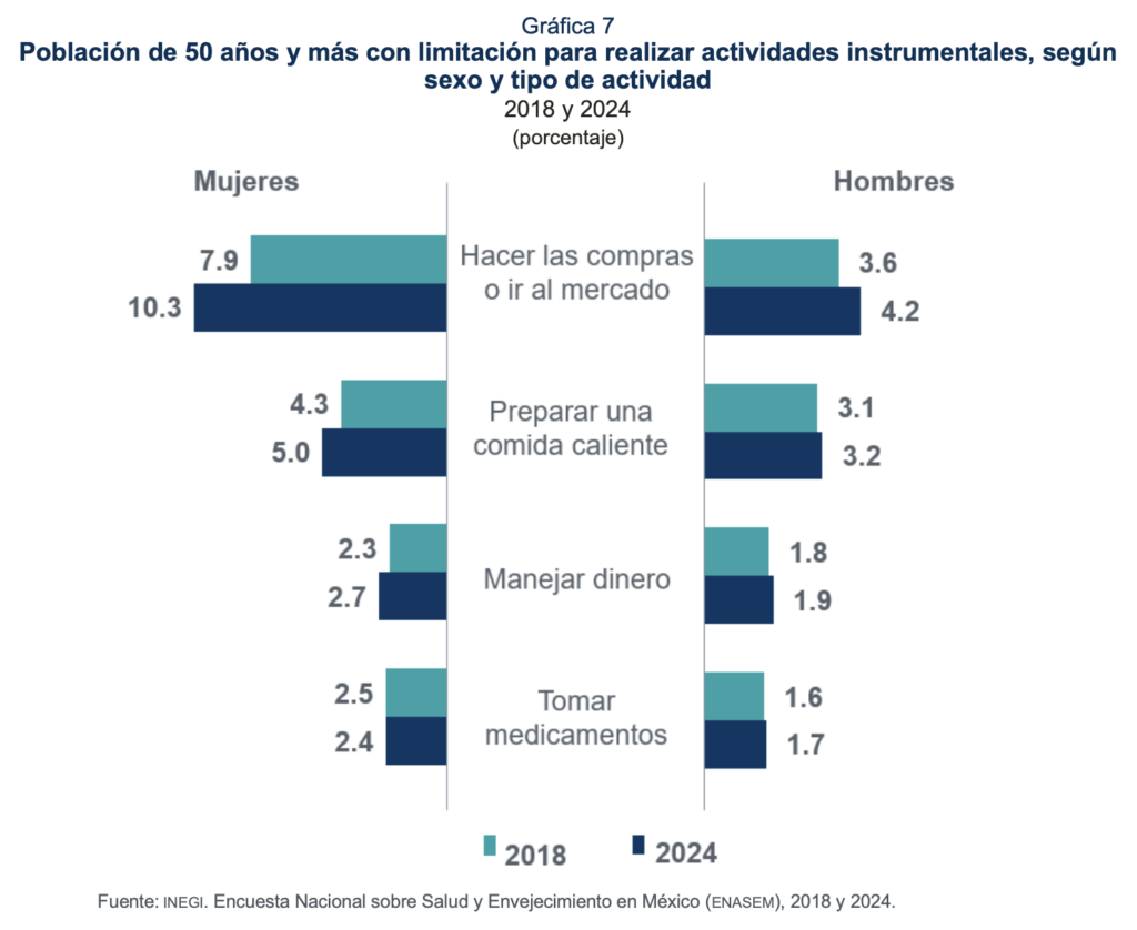 En 2024, 9.3 % de las personas de 50 años y más afirmó tener al menos una limitación para realizar actividades instrumentales de vida diaria, como hacer compras, preparar alimentos, manejar el dinero, entre otras. Para las mujeres el porcentaje fue 12.4 y para los hombres, 5.8.