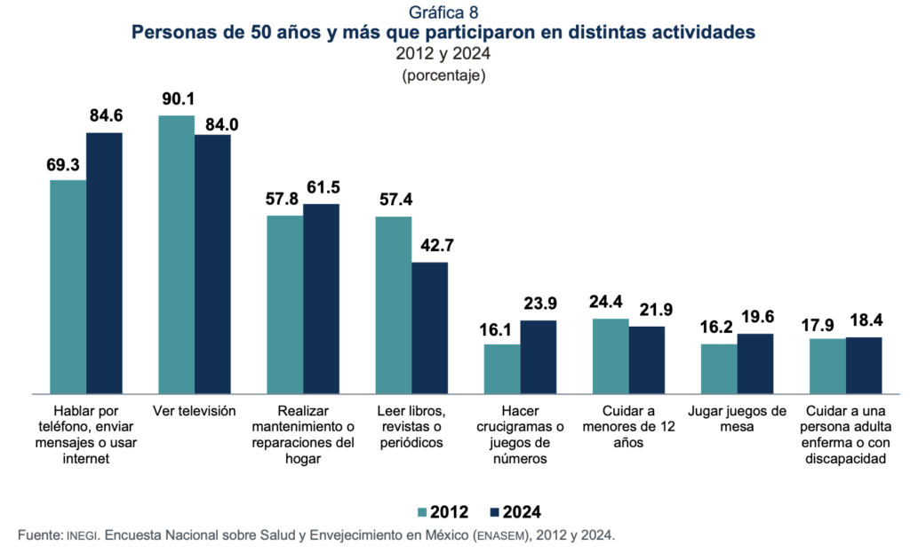 Las actividades que realizaron las personas de 50 años y más muestran cambios en el tiempo. En 2024, 84.6 % participó en actividades relacionadas con la comunicación digital (hablar por teléfono, enviar mensajes o usar internet). Asimismo, ver televisión aún resultó como una de las actividades más frecuentes entre las personas adultas, aunque descendió 6.1 puntos porcentuales en 2024 con respecto a 2012. Actividades como leer libros o revistas, hacer crucigramas y realizar mantenimiento en el hogar mostraron también niveles altos de participación, aunque con variaciones moderadas en los años observados (ver gráfica 8).